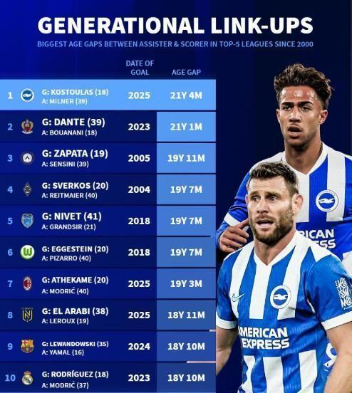 这粒进球成为欧洲五大联赛历史上年龄差最大的进球连线,没有之一(年龄跨度长达21年4个月)。更令人瞠目结舌的事实是,2002年11月10日,当身披利兹联战袍的米尔纳完成英超首秀,成为英超历史上最年轻的进球者之一时,被他助攻的科斯图拉斯,还要再等一段时间才会降临到这个世界上。